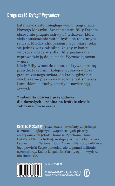 Południowy zachód Stanów Zjednoczonych. Lata II wojny światowej. Billy Parham, nastoletni kowboj, trzykrotnie przeprawia się do Meksyku. Za każdym razem cel jest inny: polowanie na wilczycę, pościg za koniokradami, poszukiwanie zaginionego brata. Przeprawa to jednak nie tylko przekroczenie granicy między dwoma krajami. To także wędrówka w głąb duszy, wkroczenie w dorosłość, przekroczenie granicy życia i śmierci. Ta przepiękna westernowa opowieść jest zarazem przesyconą melancholią powieścią o dojrzewaniu, utracie niewinności, zdobyciu mądrości i odwagi.