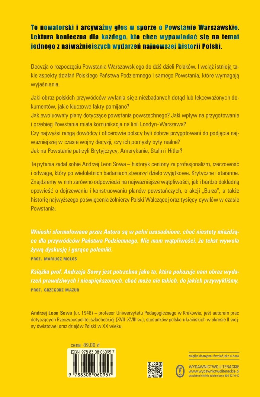 Dyskusja na temat konieczności i sensu Powstania Warszawskiego rozpoczęła się jeszcze przed jego wybuchem i toczy się nadal. W ręce czytelników trafia nowy i niezwykle ważny głos w tej dyskusji — książka Andrzeja Leona Sowy, wybitnego historyka cenionego za niezwykle rzeczowe podejście do omawianych zagadnień i za skrupulatność w badaniu źródeł.