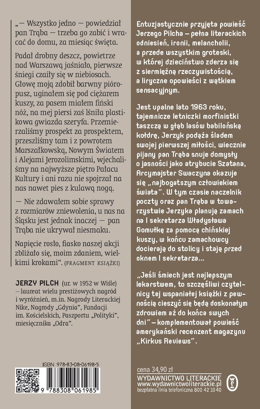 Jerzy PilchEntuzjastycznie przyjęta powieść Jerzego Pilcha – pełna literackich odniesień, ironii, melancholii, a przede wszystkim groteski, w której dzieciństwo zderza się z siermiężną rzeczywistością, a liryczne opowieści z wątkiem sensacyjnym.