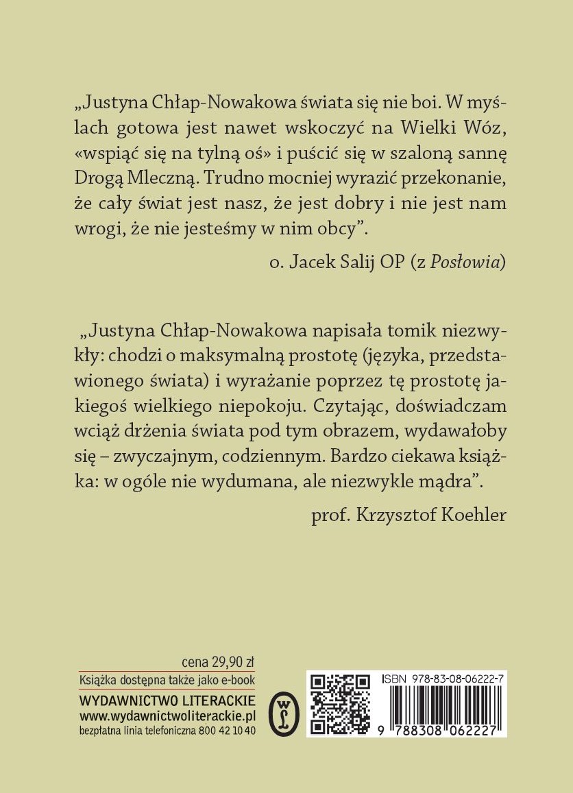 „Justyna Chłap-Nowakowa świata się nie boi. W myślach gotowa jest nawet wskoczyć na Wielki Wóz, «wspiąć się na tylną oś» i puścić się w szaloną sannę Drogą Mleczną. Trudno mocniej wyrazić przekonanie, że cały świat jest nasz, że jest dobry i nie jest nam wrogi, że nie jesteśmy w nim obcy”.