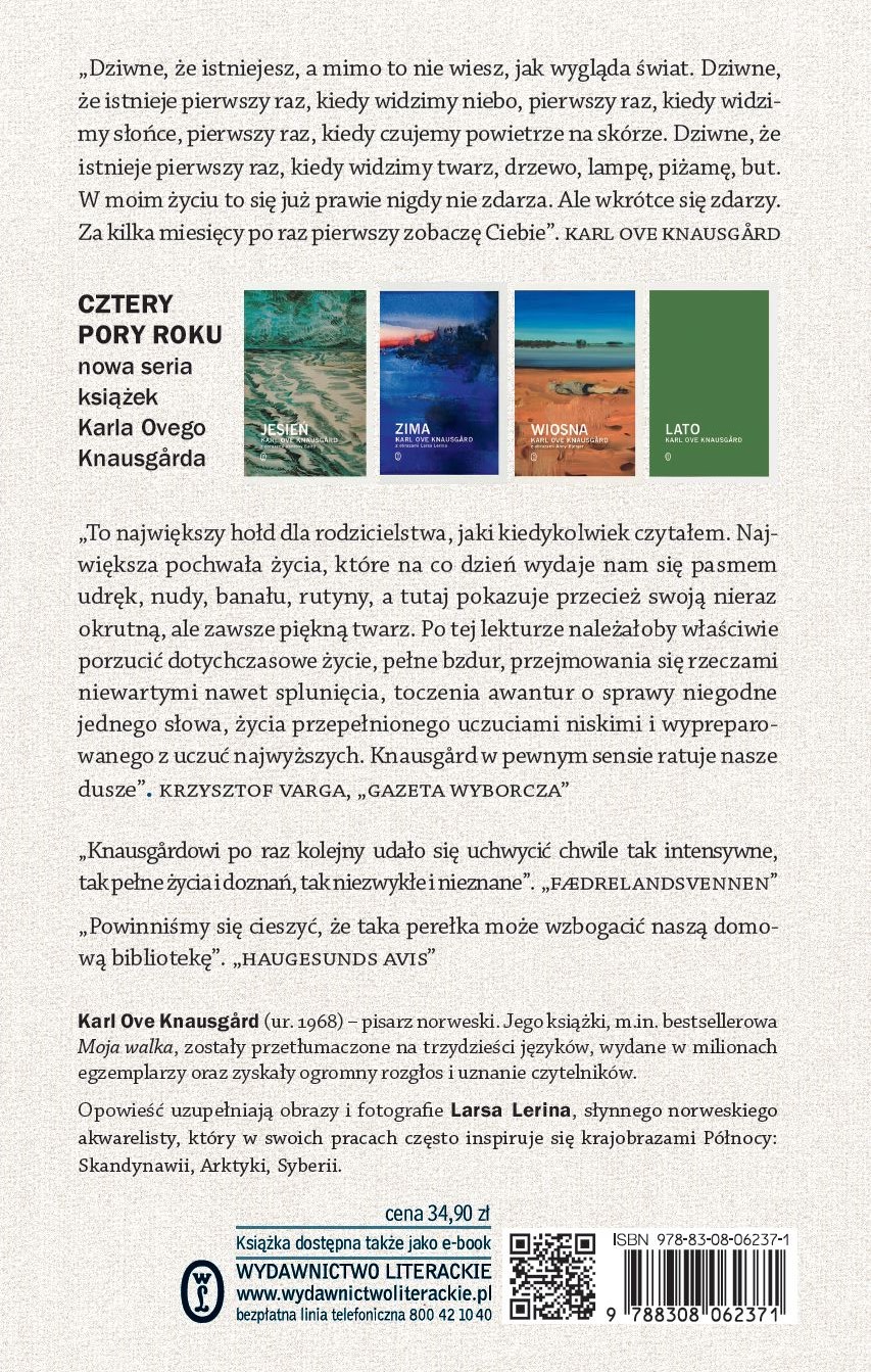 Zima to druga część cyklu Cztery pory roku autorstwa Karla Ovego Knausgårda, pisarza, któremu światową sławę przyniosła monumentalna, sześciotomowa powieść autobiograficzna Moja walka. Jego opowieści towarzyszą znakomite grafiki Larsa Lerina, „spektakularnie piękne”, jak określił je szwedzki dziennik „Expressen”.