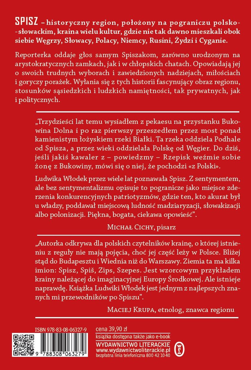 Ludwika Włodek od dzieciństwa przygląda się temu pogranicznemu tyglowi. Spędzała na Spiszu wakacje. Potem wracała tam jako badaczka i reporterka. Zebrała relacje zaskakujące i nieoczywiste, w których ideologia przeplata się z codziennością, a wielkie wojny z małymi ludzkimi dramatami. Oddała głos samym Spiszakom, tym urodzonym na arystokratycznych zamkach i tym w chłopskich chatach. Bogatym i biednym, wesołkom i ponurakom, kobietom i mężczyznom. Opowiadają jej o swoich trudnych wyborach i zawiedzionych nadziejach, miłościach i goryczy porażek. Wyłania się z tych historii fascynujący portret regionu, stosunków sąsiedzkich i uniwersalnych ludzkich namiętności, tych prywatnych i tych politycznych.