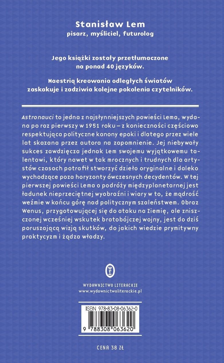 Astronauci to jedna z najsłynniejszych powieści Lema, wydana po raz pierwszy w 1951 roku – z konieczności częściowo respektująca polityczne kanony epoki i dlatego przez wiele lat skazana przez autora na zapomnienie. Jej niebywały sukces zawdzięcza jednak Lem swojemu wyjątkowemu talentowi, który nawet w tak mrocznych i trudnych dla artystów czasach potrafił stworzyć dzieło oryginalne i daleko wychodzące poza horyzonty ówczesnych decydentów. W tej pierwszej powieści Lema o podróży międzyplanetarnej jest ładunek nieprzeciętnej wyobraźni i wiary w to, że mądrość weźmie w końcu górę nad politycznym szaleństwem. Obraz Wenus, przygotowującej się do ataku na Ziemię, ale zniszczonej wcześniej wskutek bratobójczej wojny, jest do dziś poruszającą wizją skutków, do jakich wiedzie prymitywny praktycyzm i żądza władzy.