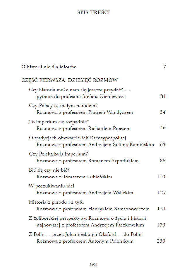 Historia nie dla idiotów składa się z dwóch części: wywiadów i esejów. W pierwszej autor rozmawia ze znakomitymi eseistami oraz historykami: Piotrem Wandyczem, Andrzejem Sulimą Kamińskim, Romanem Szporlukiem, Tomaszem Łubieńskim, Andrzejem Walickim, Henrykiem Samsonowiczem, Antonym Polonskym i Andrzejem Paczkowskim. W rozmowach przewijają się pojęcia patriotyzmu, pamięci, zdrady i polityki. Przenikliwe i wielowarstwowe odpowiedzi rozmówców gwarantują czytelnikowi pogłębioną refleksję nad wspólnotą polityczną i najważniejszymi wartościami w życiu społecznym. W drugiej części książki profesor szuka odpowiedzi na pytania o polską tożsamość oraz pozycję w świecie – od chrztu Polski po działalność IPN.