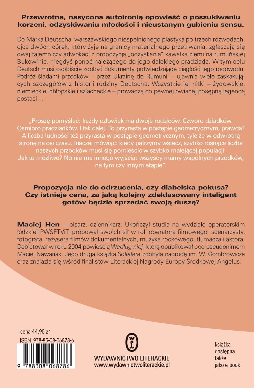 Do Marka Deutscha, niespełnionego warszawskiego plastyka, który u progu starości żyje na granicy materialnego przetrwania, zgłaszają się dwaj tajemniczy adwokaci z propozycją odzyskania kawałka ziemi na rumuńskiej Bukowinie, niegdyś ponoć należącego do jakiegoś jego dalekiego pradziada. W tym celu Deutsch musi jednak osobiście zdobyć dokumenty potwierdzające ciągłość jego rodowodu. Podróż śladami przodków – przez Ukrainę do Rumunii – ujawnia wiele zaskakujących szczegółów z historii rodziny Deutscha. Wszystkie jej nitki – żydowskie, niemieckie, chłopskie i szlacheckie – prowadzą do pewnej owianej posępną legendą postaci historycznej…