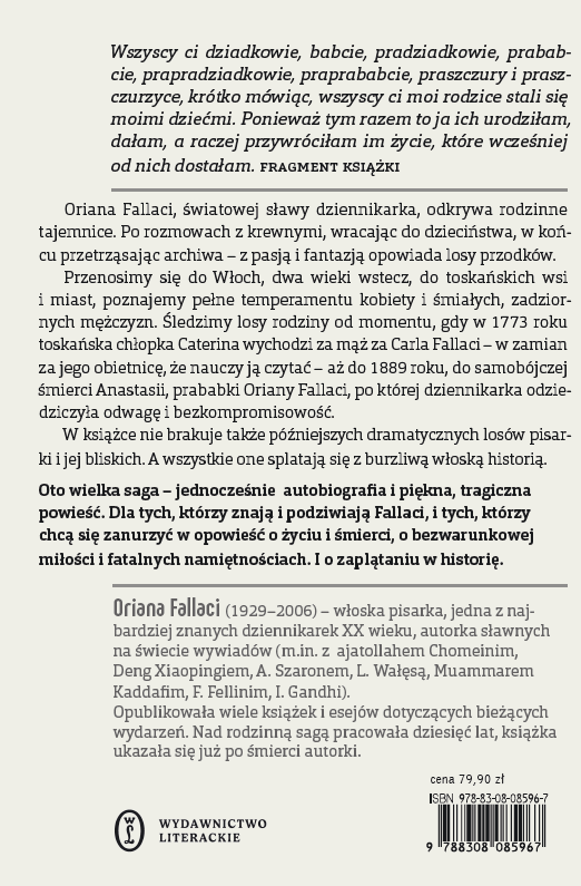 Porywająca historia dumnych i niespokojnych przodków Oriany Fallaci – hardej chłopki Cateriny i jej męża, utracjusza Carla; mściwego żeglarza Francesca; poległego w powstaniu krakowskim Stanisława; Antonia, który chciał być księdzem, a trafił przed ślubny ołtarz; rzeźbiarza Giobatty; nieprawej córki hiszpańskiego granda; młodziutkiej baletnicy, na którą za oceanem czekał dom publiczny… Niepiśmiennych chłopów, artystów, buntowników, uciekinierów, bohaterów i tchórzy.
