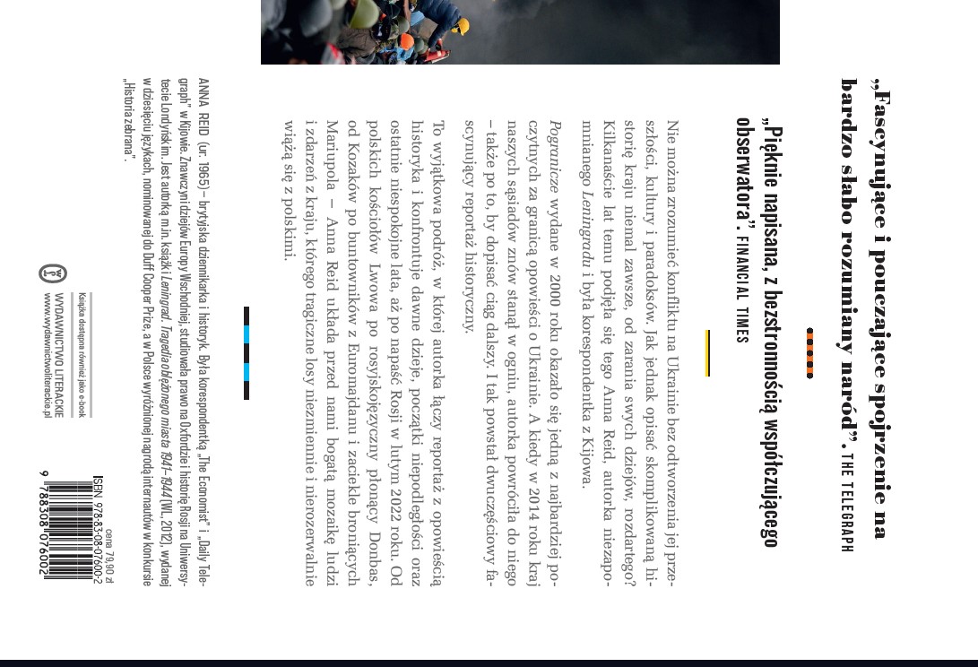 Z tym problemem niewielu odważyło się zmierzyć i chyba nikt nie osiągnął tak dobrego efektu, jak Anna Reid, autorka cenionej w Polsce i na świecie książki o oblężonym Leningradzie. Pogranicze… to nietuzinkowe połączenie książki historycznej i reportażu. Opowieść Reid jest zarazem podróżą po współczesnej Ukrainie i wędrówką przez jej dzieje, inspirowaną odwiedzanymi miejscami. Od Rusi Kijowskiej przez rządy mongolskie, litewskie, polskie i rosyjskie, niemieckie i sowieckie po dzień dzisiejszy – nie ulegając idealizującej ukraińskiej autokreacji ani tradycyjnej i współczesnej propagandzie rosyjskiej – Anna Reid scala ukraińską przeszłość w barwny, zapadający w pamięć, tragiczny i pouczający obraz nierozerwalnie związany z naszą narodową historią. Od polskich kościołów Lwowa po rosyjskojęzyczny przemysłowy Donbas autorka ukazuje Ukrainę dawną i tę w granicach młodego państwa wraz z jego mieszkańcami: babuszką pamiętającą czasy Wielkiego Głodu, donieckim górnikiem, krymskim Rosjaninem, Polakiem z Kamieńca Podolskiego, Żydem z Iwano-Frankiwska, dysydentem z czasów sowieckich czy współczesnymi mieszkańcami Kijowa.