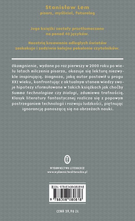 Okamgnienie wydane po raz pierwszy w 2000 roku, po wielu latach milczenia pisarza, okazuje się lekturą niezwykle inspirującą. Diagnoza, jaką autor postawił na początku XXI wieku, zdumiewa swoją trafnością. Klasyk literatury fantastycznej „schodzi na ziemię” i rozlicza się z pop-naukowym postrzeganiem technologii i rozwoju ludzkości.