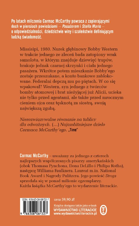 Po latach milczenia wybitny amerykański prozaik, laureat Nagrody Pulitzera i autor kultowej Drogi powraca z mistrzowską dylogią. Pasażer i Stella Maris są jak dwie strony lustra, a prawda jednej powieści zdaje się zaprzeczać prawdziwości drugiej.