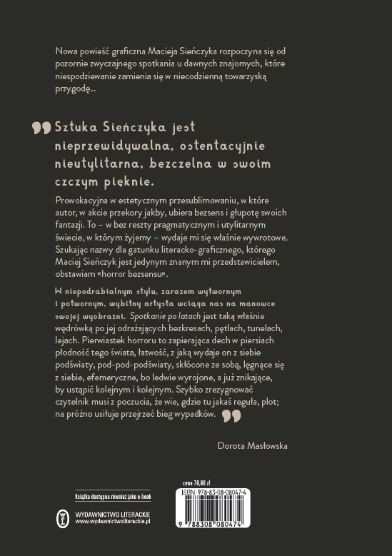 W niepodrabialnym stylu, zarazem wytwornym i potwornym, wybitny artysta wciąga nas na manowce swojej wyobraźni. Spotkanie po latach jest taką właśnie wędrówką po jej odrażających bezkresach, pętlach, tunelach, lejach. Pierwiastek horroru to zapierająca dech w piersiach płodność tego świata, łatwość, z jaką wydaje on z siebie podświaty, pod-pod-podświaty, skłócone ze sobą, lęgnące się z siebie, efemeryczne, bo ledwie wyrojone, a już znikające, by ustąpić kolejnym i kolejnym. Szybko zrezygnować czytelnik musi z poczucia, że wie, gdzie tu jakaś reguła, plot; na próżno usiłuje przejrzeć bieg wypadków”.