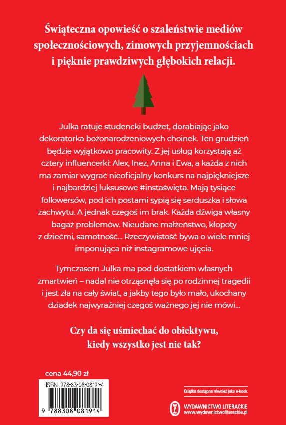 Grudniowy Poznań przykryty śnieżną pierzyną. Przedświąteczne zakupy. A w samym środku tego szaleństwa Julka, która dorabia sobie jako dekoratorka bożonarodzeniowych choinek u najbogatszych mieszkańców miasta. Jej tegorocznymi klientkami są cztery influencerki: Alex, Inez, Anna i Ewa. Każda z nich ma zamiar wygrać nieoficjalny konkurs na najpiękniejsze #instaświęta. Mimo blichtru i luksusu pokazywanego w mediach społecznościowych, wszystkie dźwigają własny bagaż problemów. Kłopoty z dorastającymi dziećmi, nieudane małżeństwo, samotność... A jednak istnieje dom Julki i jej dziadka, w którym kobiety odkryją, jak łatwo można być sobą i odnaleźć prawdziwe rodzinne ciepło.