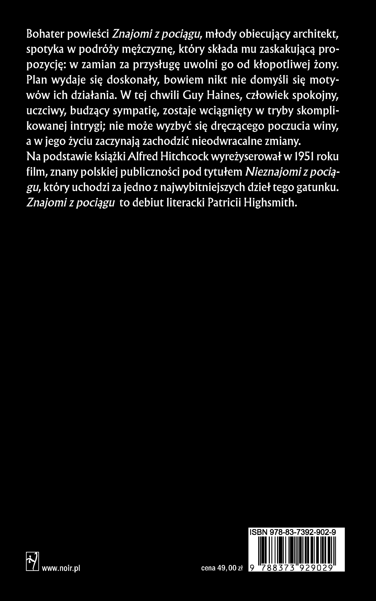Patricia HighsmithBohater powieści "Znajomi z pociągu", młody obiecujący architekt, spotyka w podróży mężczyznę, który składa mu zaskakującą propozycję: w zamian za inną przysługę uwolni go od kłopotliwej żony. Plan wydaje się doskonały, bowiem nikt nie domyśli się motywów ich działania.