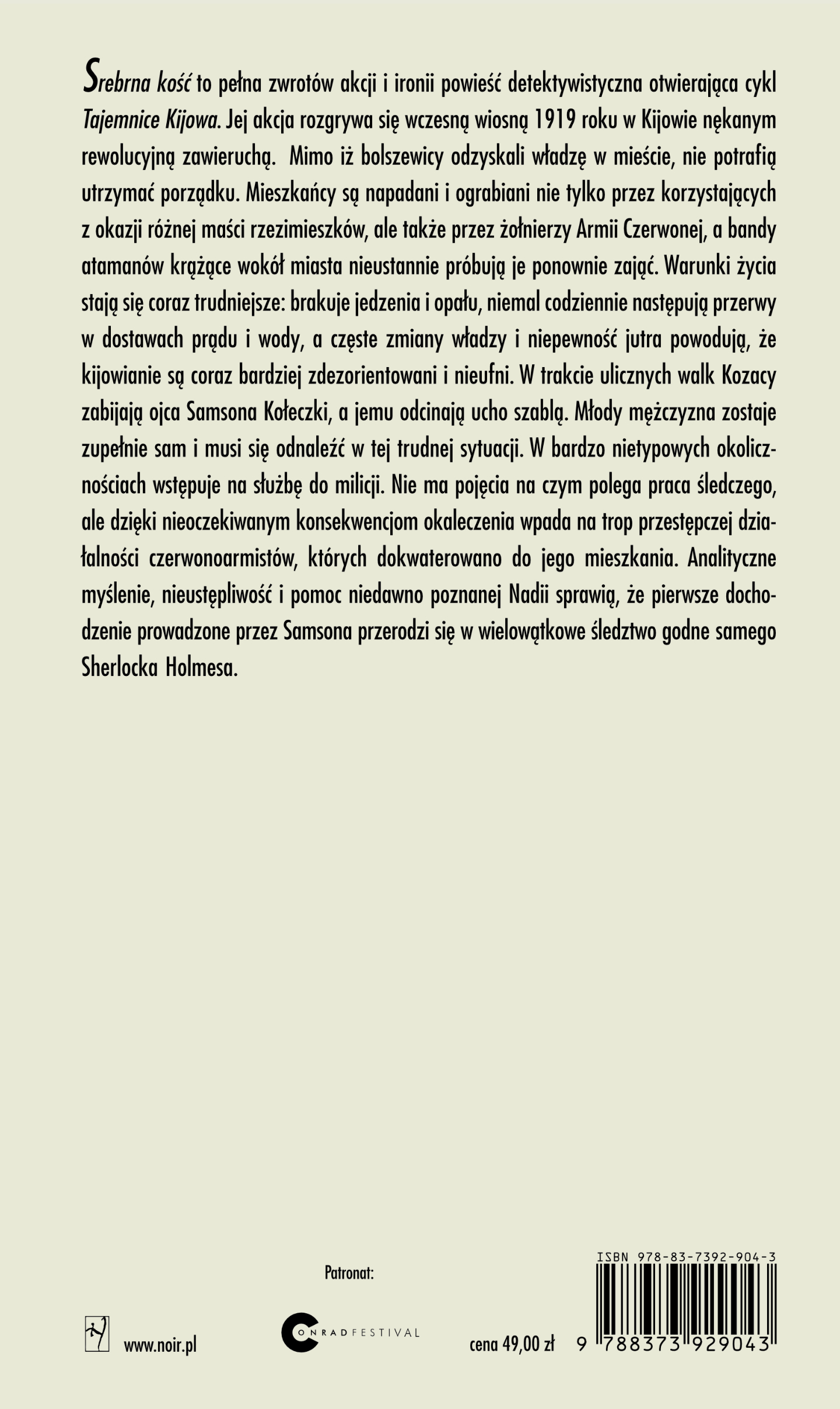 Nominowana do Nagrody Bookera "Srebrna kość" to pełna zwrotów akcji i ironii powieść detektywistyczna otwierająca cykl "Tajemnice Kijowa". Jej akcja rozgrywa się wczesną wiosną 1919 roku w Kijowie nękanym rewolucyjną zawieruchą.