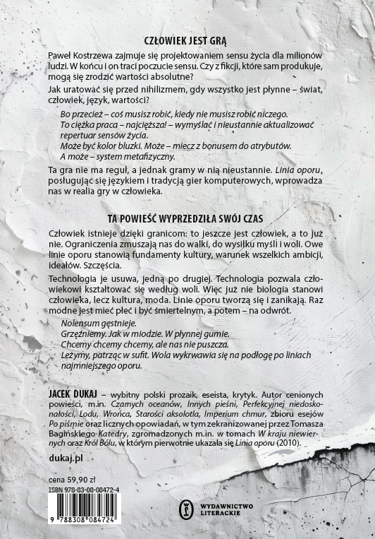 Jacek Dukaj mawia, że jego utwory nie są przewidywaniem przyszłości, tylko naturalną konsekwencją tego, jaka przyszłość mogłaby być, gdyby spełniły się wybrane założenia. W tym jednak sensie Linia oporu jest tekstem niemal profetycznym, bo jej założenia spełniają się na naszych oczach. W jej świecie zanikła wszelka konieczność życiowa. Postęp technologiczny, a w jego efekcie wzrost posiadania, umożliwia zaspokajanie bazowych potrzeb. Ludziom nie brakuje niczego do wygodnego życia. (…) Ostatecznym frontem staje się rozrywka: miliardy konsumentów potrzebują czegoś do robienia, skoro mogą robić wszystko, a nie muszą nic. Stąd więc „plaje” (seriale, filmy, opowieści, wszelka rozrywka do pasywnego przeżywania) oraz „szlaje” („shared play”, wspólnie i aktywne przeżywane). Niektórzy „gejdżują się”, modyfikując chemię mózgu, byle zadać sobie chcenie. Bo ostatnim towarem deficytowym stał się sens życia. (fragment wstępu)
