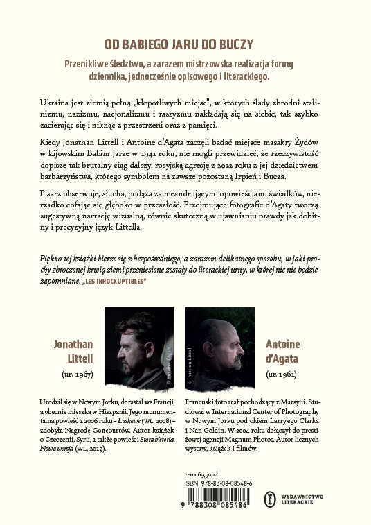 Gdy Jonathan Littell wraz z fotografem Antoine’em d’Agatą zaczynali badać ślady, jakie pozostały w krajobrazie Babiego Jaru w Kijowie po masakrze Żydów w 1941 roku, nie sądzili, że rzeczywistość napisze tak brutalny ciąg dalszy. Rosyjska agresja na Ukrainę w 2022 roku zostawiła swoje dziedzictwo barbarii, której synonimem na zawsze będą już Bucza i Irpień.