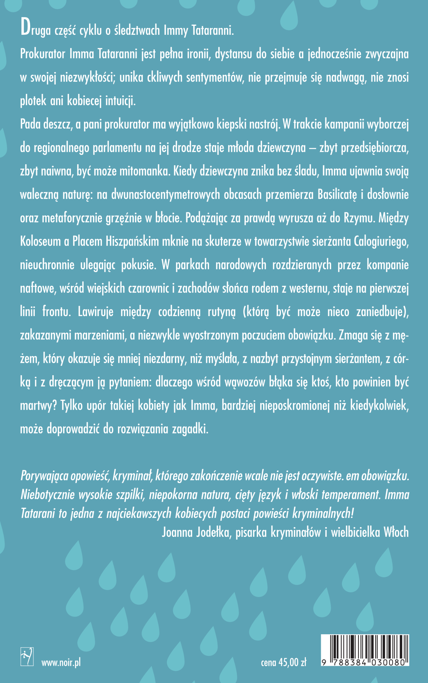 Pada deszcz, a pani prokurator ma wyjątkowo kiepski nastrój. W trakcie kampanii wyborczej do regionalnego parlamentu na jej drodze staje młoda dziewczyna – zbyt przedsiębiorcza, zbyt naiwna, być może mitomanka. Kiedy dziewczyna znika bez śladu, Imma zaczyna patrzeć na całą sytuację w zupełnie innym świetle: czyżby ktoś próbował ją wrobić? Wówczas ujawnia swoją waleczną naturę, na dwunastocentymetrowych obcasach przemierzając Basilicatę, która w tej ponurej aurze przypomina bardziej Transylwanię, i dosłownie oraz metaforycznie grzęznąc w błocie. Podążając za prawdą zakorzenioną głęboko w przeszłości, wyrusza aż do Rzymu. Między Koloseum a Placem Hiszpańskim mknie na skuterze w towarzystwie sierżanta Calogiuriego, nieuchronnie ulegając pokusie. Jednak nawet na jej ulubieńca pada cień podejrzeń.