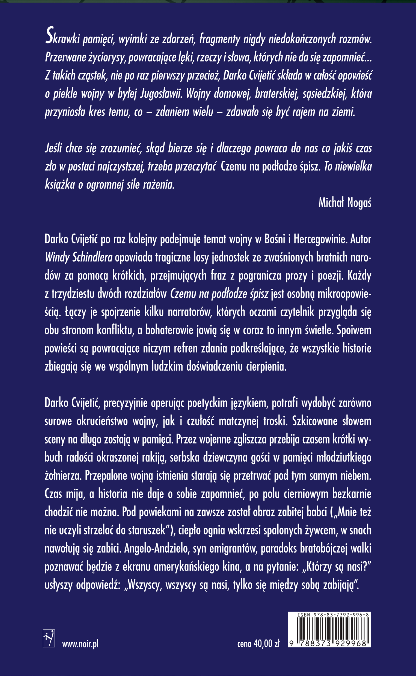 Darko CvijetićDarko Cvijetić po raz kolejny podejmuje temat wojny w Bośni i Hercegowinie. Autor „Windy Schindlera" opowiada tragiczne losy jednostek ze zwaśnionych bratnich narodów za pomocą krótkich, przejmujących fraz z pogranicza prozy i poezji.
