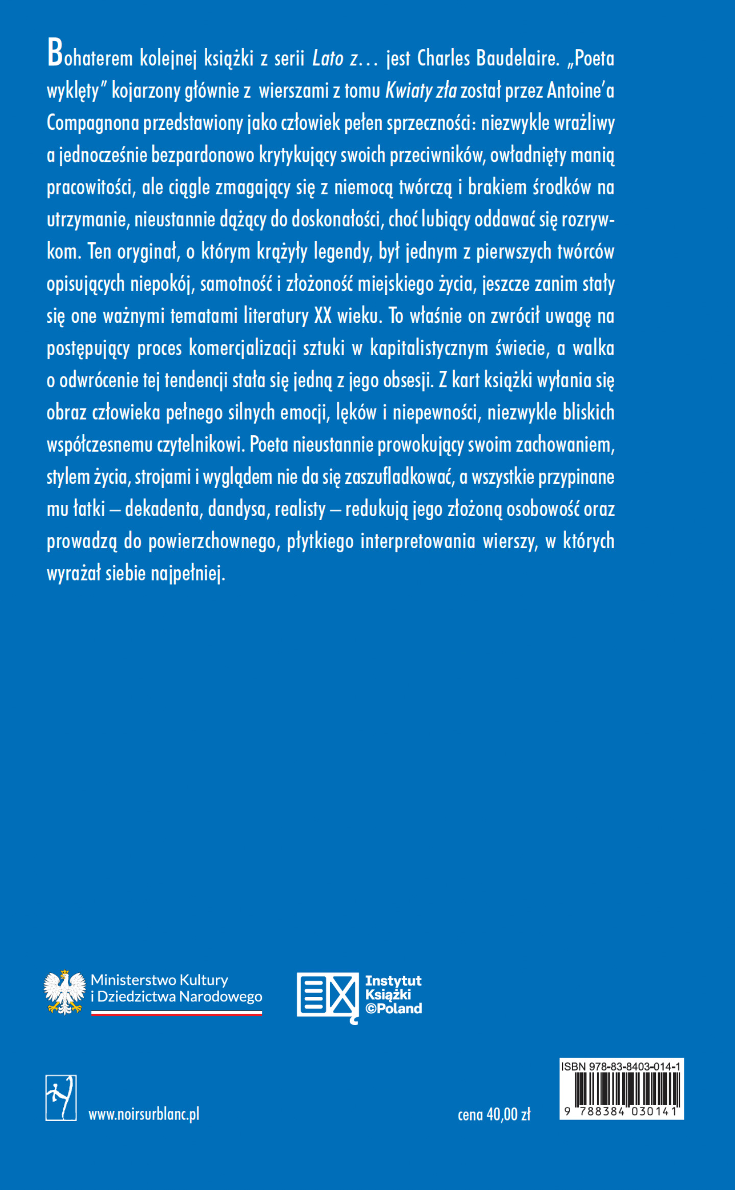 Bohaterem kolejnej książki z serii „Lato z…" jest Charles Baudelaire. „Poeta wyklęty” kojarzony głownie z wierszami z tomu „Kwiaty zła" został przez Antoine’a Compagnona przedstawiony jako człowiek pełen sprzeczności: niezwykle wrażliwy a jednocześnie bezpardonowo krytykujący swoich przeciwników, owładnięty manią pracowitości a równocześnie ciągle zmagający się z niemocą twórczą i brakiem środków na utrzymanie, nieustannie dążący do doskonałości choć lubiący oddawać się rozrywkom. Ten oryginał, o którym krążyły legendy, był jednym z pierwszych twórców opisujących niepokój, samotność i złożoność miejskiego życia, jeszcze zanim stały się one ważnymi tematami literatury XX wieku. To właśnie on zwrócił uwagę na postępujący proces komercjalizacji sztuki w kapitalistycznym świecie, a walka o odwrócenie tej tendencji stała się jedną z jego obsesji. Z kart książki wyłania się obraz człowieka pełnego silnych emocji, lęków i niepewności, jakże bliskich współczesnemu czytelnikowi. Poeta nieustannie prowokujący swoim zachowaniem, stylem życia, strojami i wyglądem nie da się zaszufladkować, wszystkie przypinane mu łatki – dekadenta, dandysa, realisty – redukują jego złożoną osobowość oraz prowadzą do powierzchownego, płytkiego interpretowania wierszy, w których wyrażał siebie najpełniej.