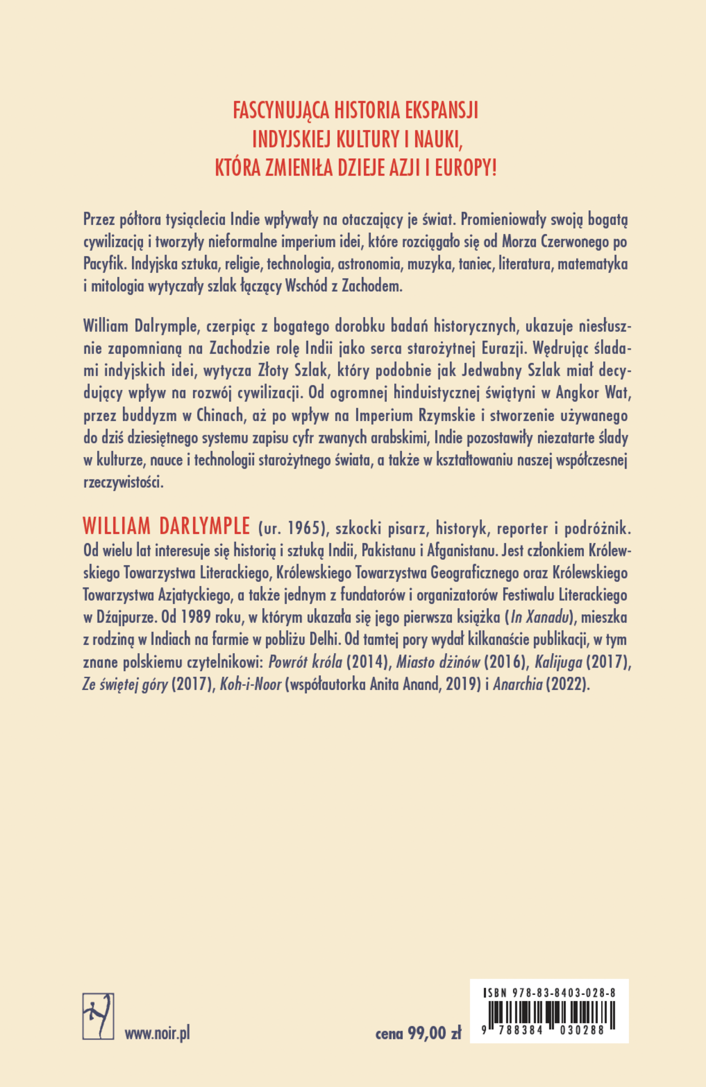 William Dalrymple, czerpiąc z bogatego dorobku badań historycznych, ukazuje niesłusznie zapomnianą na Zachodzie rolę Indii jako serca starożytnej Eurazji. Wędrując śladami indyjskich idei, wytycza Złoty Szlak, który niczym Jedwabny Szlak miały decydujący wpływ na rozwój cywilizacji. Od ogromnej hinduistycznej świątyni w Angkor Wat, przez buddyzm w Chinach, aż po wpływ na Imperium Rzymskie i stworzenie używanego do dziś dziesiętnego systemu zapisu cyfr zwanych arabskimi, Indie pozostawiły niezatarte ślady w kulturze, nauce i technologii starożytnego świata, a także w kształtowaniu naszej współczesnej rzeczywistości.