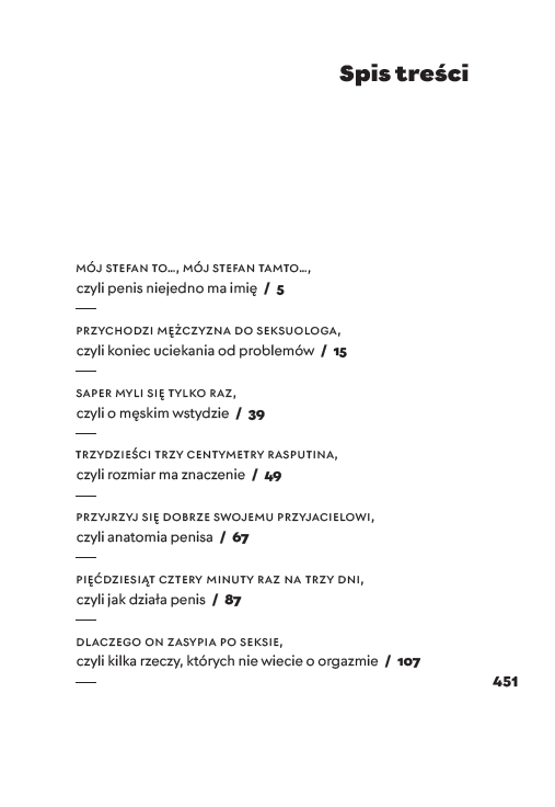 W przystępnych, błyskotliwych i niepozbawionych humoru rozmowach autorzy skutecznie obalają mity na temat męskości, posługują się fachową wiedzą, sięgając do wyników badań psychologów i seksuologów oraz do bogatego doświadczenia Andrzeja Gryżewskiego jako seksuologa i psychoterapeuty. W książce nie brakuje też nawiązań do kultury i popkultury jako źródła przykładów i punktów odniesienia.