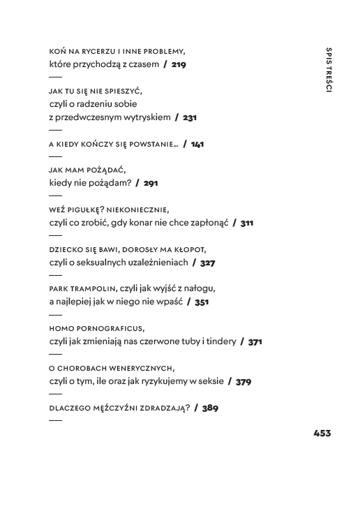 Książka, która daje czytelnikom – tym dojrzałym i tym wchodzącym w dopiero dorosłość – wgląd w siebie oraz siłę do wyjścia poza stereotypy i lęki. A czytelniczkom – uwalniającą świadomość, że mężczyźni zazwyczaj (na szczęście!) nie są tacy, za jakich chcieliby uchodzić.