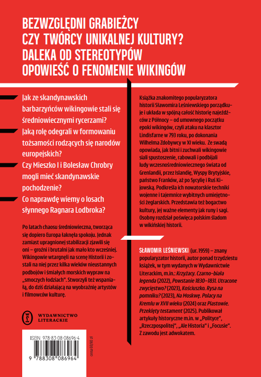 Książka znakomitego popularyzatora historii Sławomira Leśniewskiego porządkuje i układa w spójną całość historię wikingów. Opowiada o tym, jak siali spustoszenie, rabowali i podbijali ludy wczesnośredniowiecznego świata – od Grenlandii przez Islandię, Wyspy Brytyjskie, państwo Franków, aż po Sycylię i Ruś Kijowską. Autor omawia też ich nowatorskie techniki wojenne, wybitne umiejętności żeglarskie oraz przedstawia bogactwo kultury, z runami i sagami na czele. Osobny rozdział poświęca polskim śladom w wikińskiej historii.
