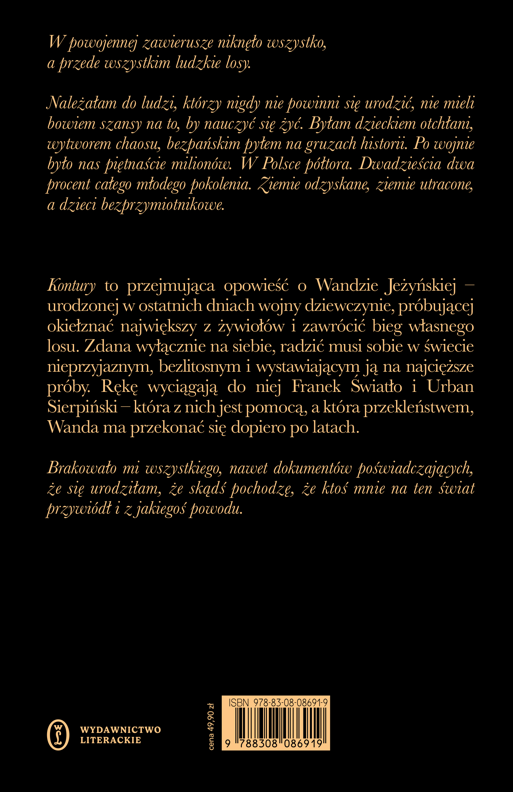 „Kontury” to przejmująca opowieść o Wandzie Jeżyńskiej – urodzonej w ostatnich dniach wojny dziewczynie, próbującej okiełznać największy z żywiołów i zawrócić bieg własnego losu. Zdana wyłącznie na siebie, radzić musi sobie w świecie nieprzyjaznym, bezlitosnym i wystawiającym ją na najcięższe próby. Rękę wyciągają do niej Franek Światło i Urban Sierpiński – która z nich jest pomocą, a która przekleństwem, Wanda ma przekonać się dopiero po latach.