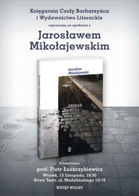 Jarosław Mikołajewski spotka się z czytelnikami z okazji premiery tomiku Żebrak. Zapraszamy do Nowego Teatru w Warszawie przy ul. Madalińskiego 10/16. Rozmowę z poetą poprowadzi prof. Piotr Łuszczykiewicz, a o dostępność książek zadba Czuły Barbarzyńca. Wtorek, 15 listopada, godz. 19.00, wstęp wolny.